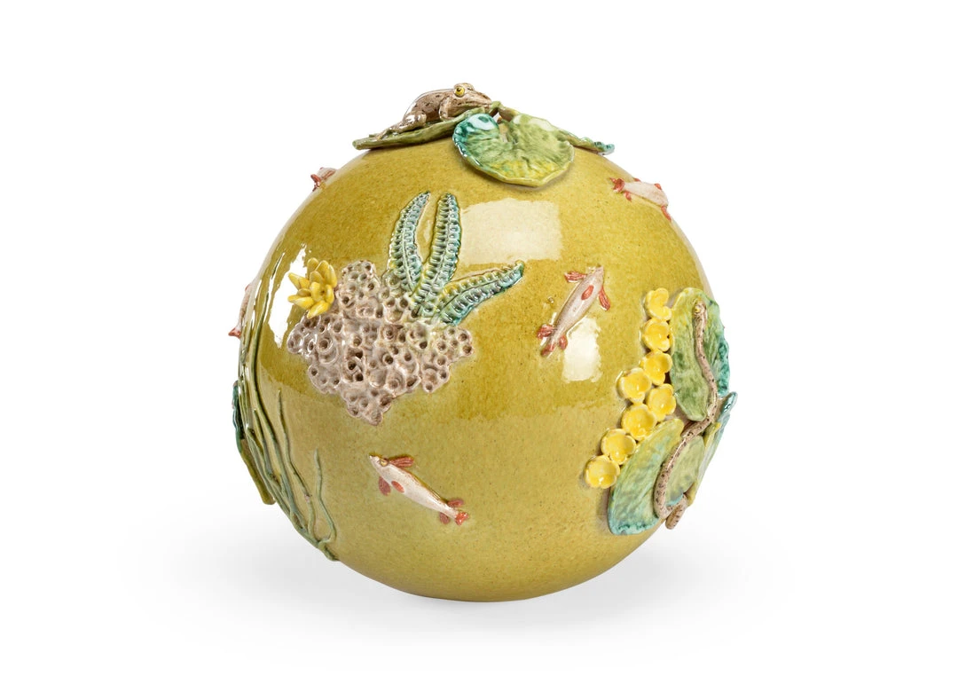 Hand Sculpted And Painted Ceramic Sphere Decorated With A Frog, Snake, Fish And Flowers In Glaze Colors From Nature.