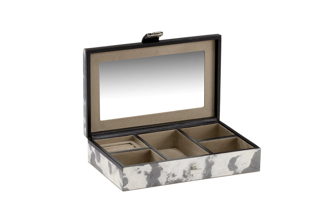 Jewelry Box With Multi Compartments, Wrapped In Parchment And Black Leather Trim. Interior Has Mirror Mounted On The Lid And Lined With Faux Taupe Suede.