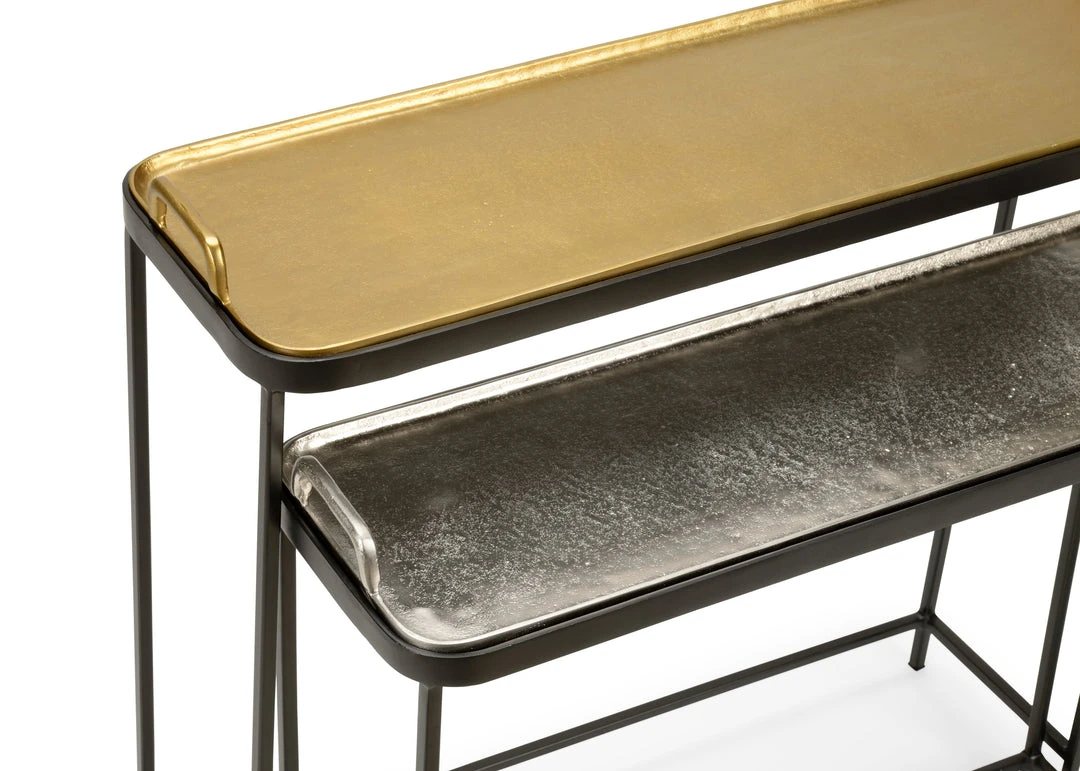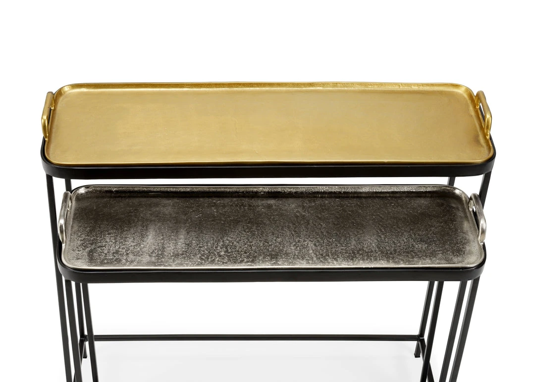 The Metal Mingler Tables Nest In A Group Of Two With Removable Trays In Gold And Nickel. Sm: 26.25″H X 29.75″W X 9.75″D, Lg:31″H X 32″W X 10.75″D.