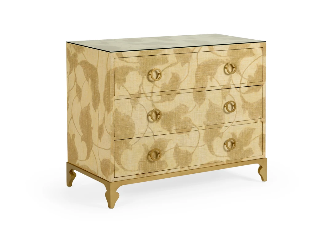 Wheat Painted Raffia On Gold Finished Iron Base With Gold Pulls And Tempered Glass Top, Not Intended For Clothing Storage.