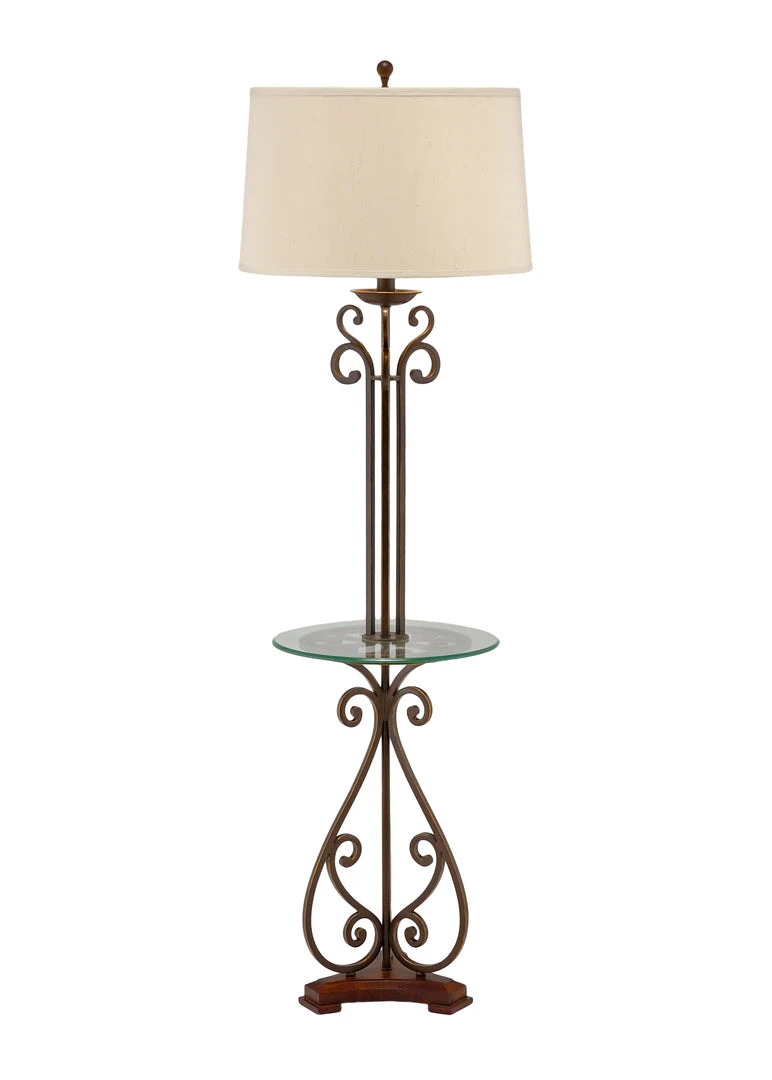 Our Traditional Floor Lamp Has It All! This Multi-Functional Design Lights Up The Room While Providing Beautiful Scrollwork Hand Formed In An Antique Bronze Finished Iron And A 16″ Beveled Glass Tabletop For Holding Your Remote Control, Magazine, Drink And More. Ideal For Placing Beside Your Favorite Arm Chair In A Bedroom, Study, Office Or Living Area.
