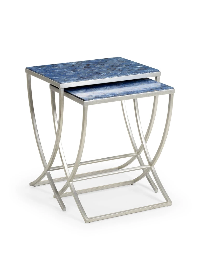 Iron Nesting Side Tables With Antique Silver Leaf Finish. Dyed Blue Penshell Tops. Sm Table 21.25w X 16d X 26h