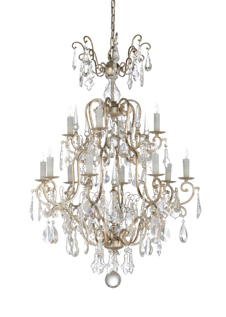 Antique Silver Leaf Finish On 12 Light Chandelier With Clear Crystals. Comes With 9 Feet Of Chain.