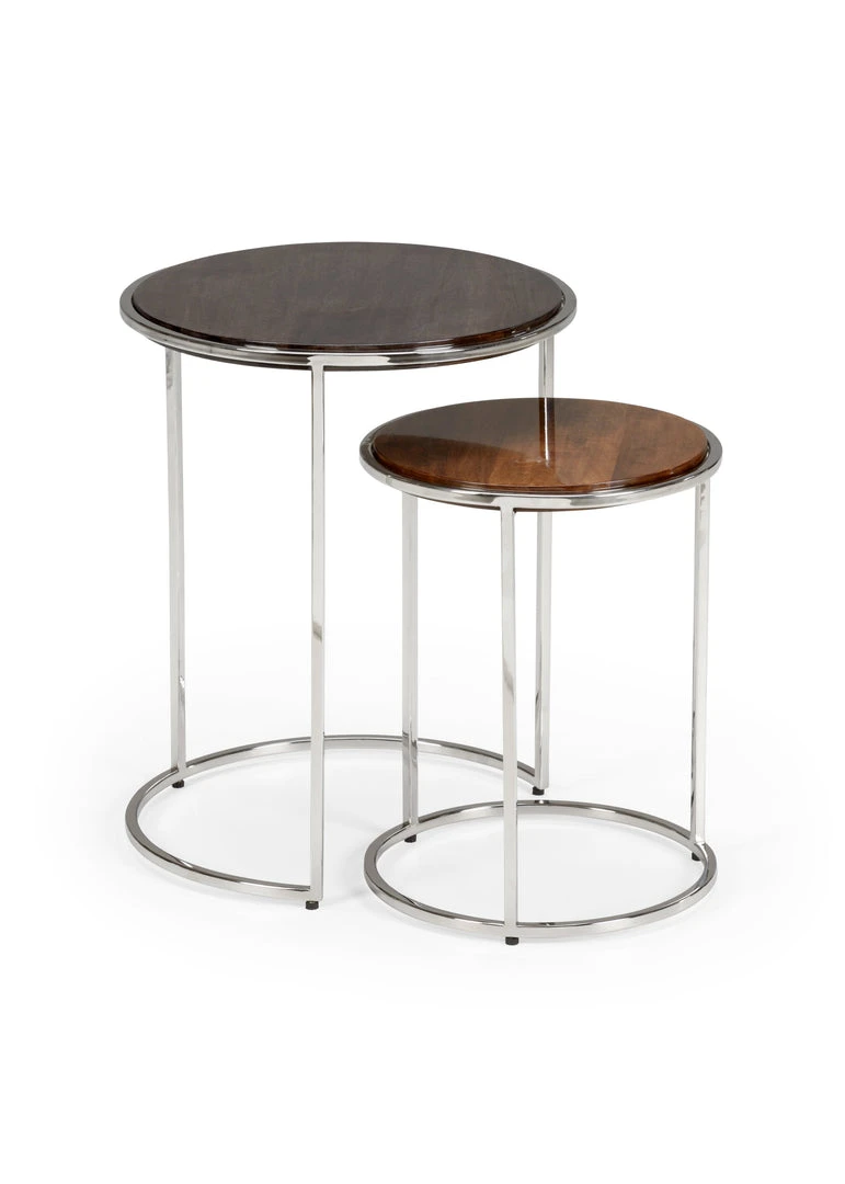 The Weymouth Drink Tables Are A Set Of Two. The Base Is Polished Nickel And Has A Wood Glossy Top. Lg: 22.5″H X 17.75″W X 17.75″D, Sm: 18″H X 14″W X 14″D.