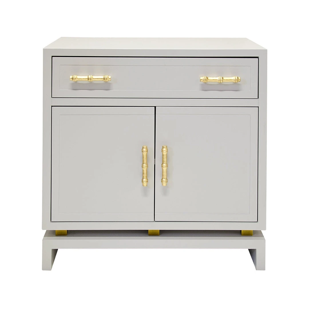 This charming, Asian-inspired lamp table instantly elevates your space. Whether adorning a hallway or living room, the matte grey lacquer finish complements virtually any color scheme. Gold leaf, bamboo style hardware adds a stylized, natural element. Plenty of useful storage with drawer and cabinet, so Marcus is not only gorgeous, but also practical.
