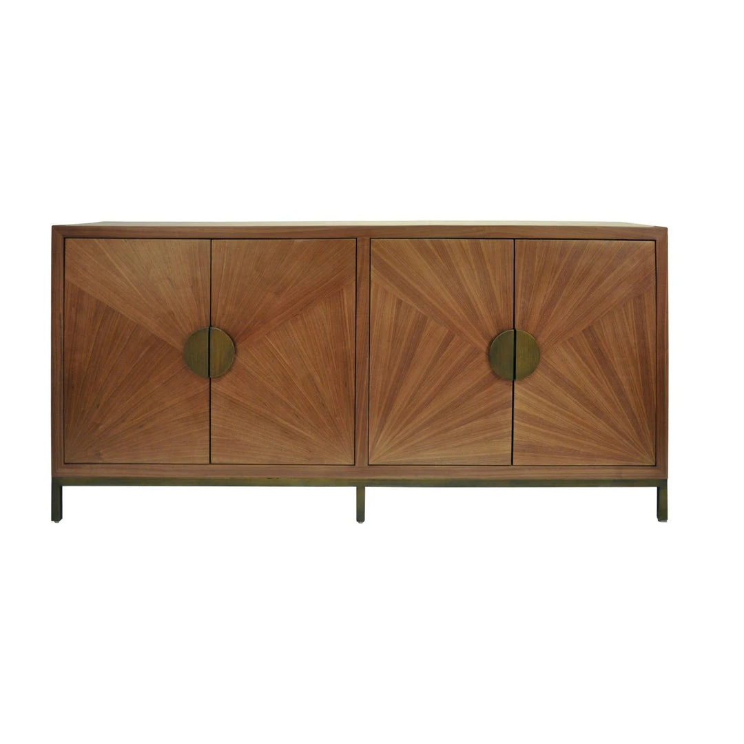 Superb styling and extraordinary detailing come together in the Emory four door cabinet. A showstopper in any room with its distinctive radial walnut finish and painted bronze legs and hardware. Stunning!