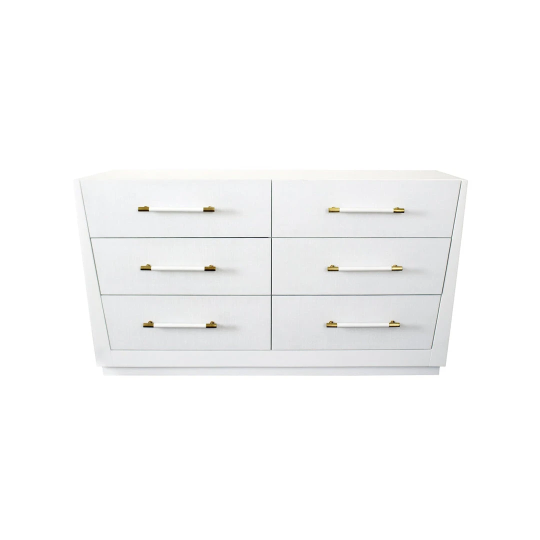 Want to add a pop of modern glamour to your space? Want storage too? The tapering silhouette of our Madden chest in matte white lacquer is exactly what you’ve been searching for. Six lacquered white linen drawers offer a subtile, yet glamourous texture, and antique brass hardware finishes the look. Tr?s chic!