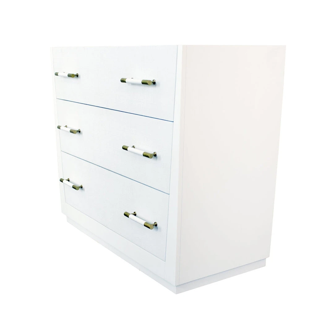 Want to add a pop of modern glamour to your space? Want storage too? The tapering silhouette of our Liam chest in matte white lacquer is exactly what you’ve been searching for. Three lacquered white linen drawers offer a subtile, yet glamourous texture, and antique brass hardware finishes the look. Tr?s chic!