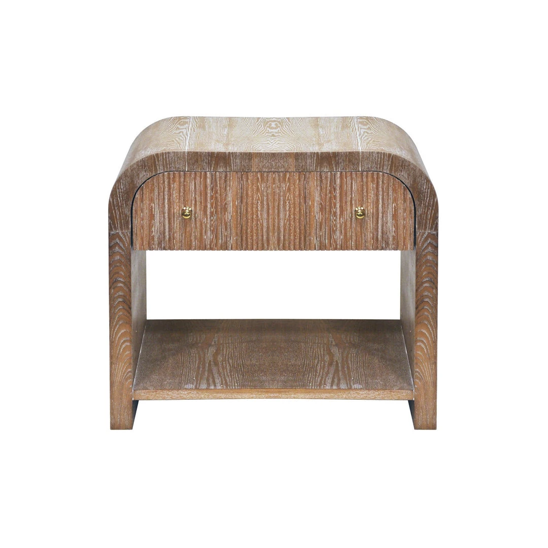 Perfectly on-trend with the Deco Moderne style revival, you’ll love all the features of our Esther side table. The waterfall edge showcases its natural wood grain and is further amplified by the dark cerused oak finish. Fluted drawer front provides additional texture & dimension, and delicate brass hardware completes the look.